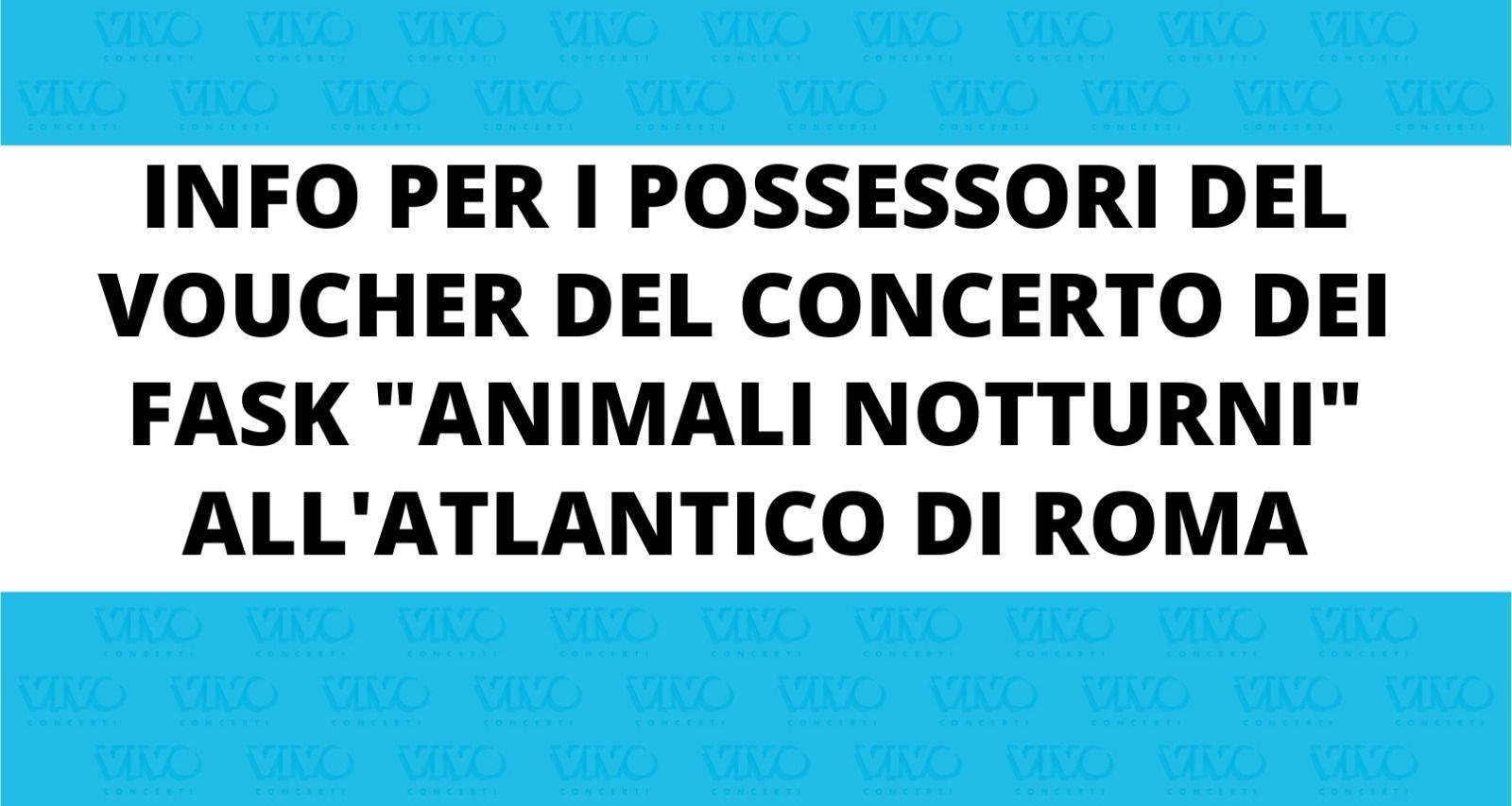 Chi è in possesso del voucher del concerto di Animali Notturni all'Atlantico di Roma, previsto per il 13 marzo 2020, può inviarlo a info@vivoconcerti.com entro il 27 settembre così da poterlo utilizzare per la data all'Atlantico del 3 maggio 2022.